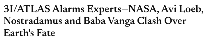 I am amused that the A-team for studying an astronomical body is Avi Loeb, Nostradamus, and Baba Vanga (a Bulgarian psychic). Do not downplay the importance of AI in interpreting images of the body. Here’s a rather speculative reconstruction of 3I/ATLAS.