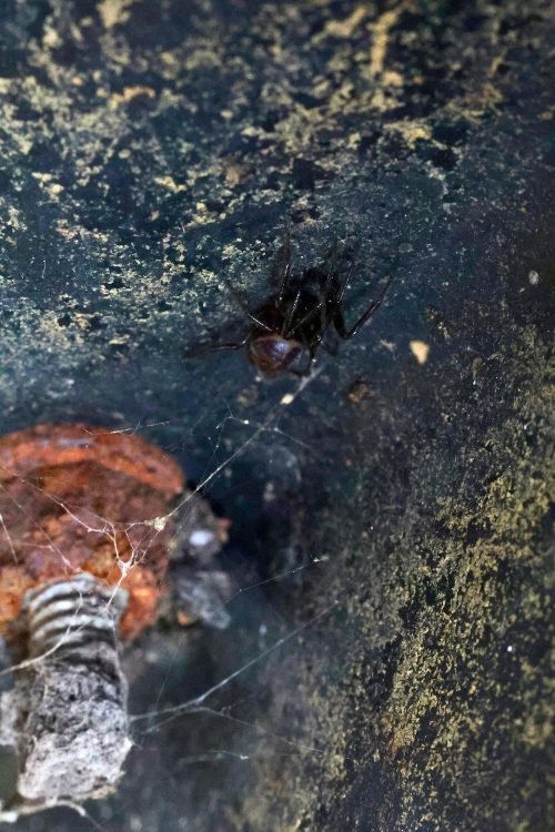 S. borealis is entirely black in body color, and she was on the side of a black bin, in shadow, deep in darkness, so getting any kind of photo was difficult. But there she was, my first Theridiidae of the new season.