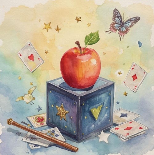 Now imagine a different approach. The apple goes into the box. The lid is pulled off and all four sides drop down simultaneously. This time, everyone sees the disappearance at the same time and the reaction is far stronger.